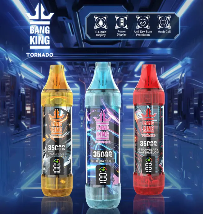 Available in 0%, 2%, 3%, and 5% nicotine strengths and 12 vibrant flavors, the Bang King Tornado caters to diverse tastes and preferences. Whether you prefer a bold hit or a smooth vape, this device has you covered.